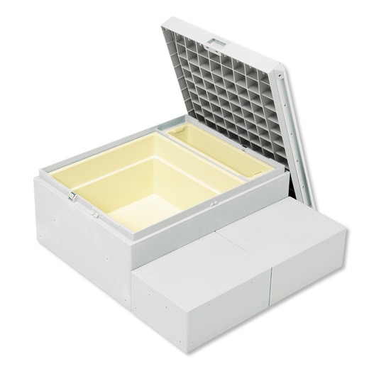 ハウスステップRタイプの箱型。ライトグレー色。専用の収納庫と、取手が付属します。