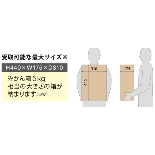 - 受取・発送対応宅配ボックス ◆受取可能な最大サイズ W175×H440×310mm (目安:みかん箱5kg相当の大きさの箱が納まります。) ◆材質 高純度フェライトステンレス ◆仕上 粉体塗装 ◆仕様 前入前出/防滴タイプ プッシュボタン錠前 ※ボックス単体では床面への固定はできません。必ず専用幅木をご使用ください。 ※防水構造ではありませんので、強風雨や諸条件によっては荷物が濡れることがあります。早めに荷物を取り出すか、軒下などで雨がかりの少ない場所へ設置してください。 ※万一雨水が侵入した場合に排水する防滴構造になっておりますが、居室に貫通する設置はおやめください。クロスや床を傷めるおそれがあります。 ※宅配物受取のため、お客様ご自身でシャチハタなど三文判をご用意のうえ、印鑑ケースに設置してください。