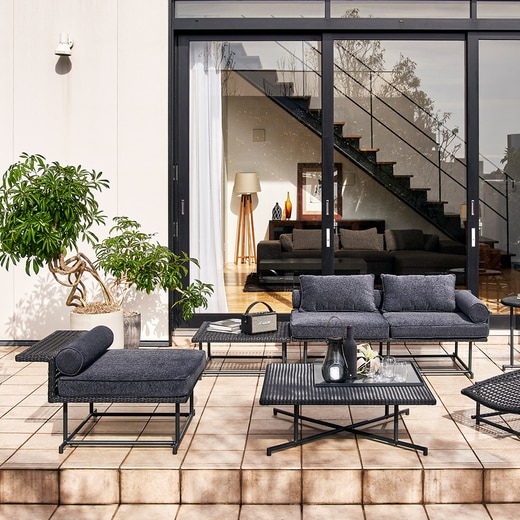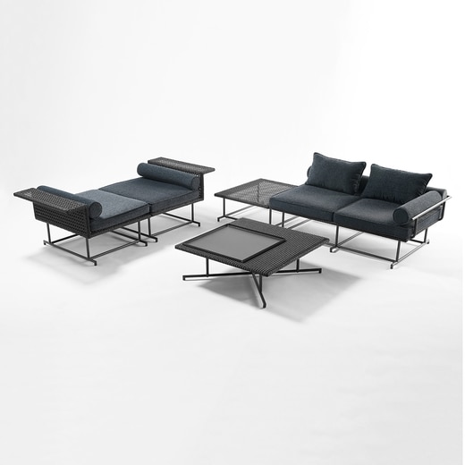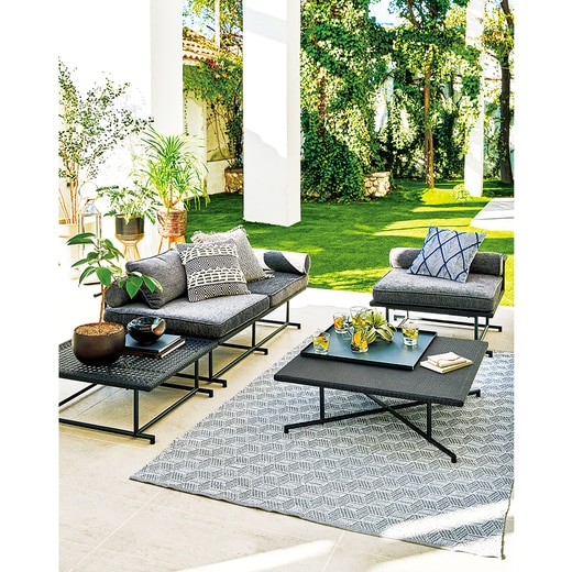 籠目をモチーフに編み上げた人工ラタンのソファシリーズ。向かい合わせに2つ合わせれば、ベンチソファとしても使うことができ、組み合わせ自由なモジュールソファです。付属のクッションは、背もたれだけでなく肘掛けとしても使用可能。
