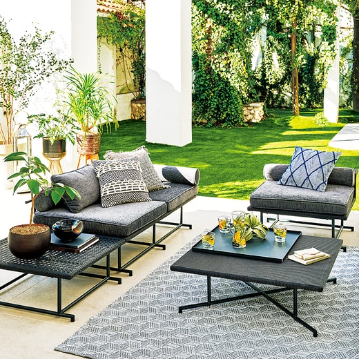 畳をモチーフに編み上げた人工ラタンの天板が美しいローテーブル。さまざまな楽しみ方ができるスクエアタイプです。※トレイは別売りとなります。