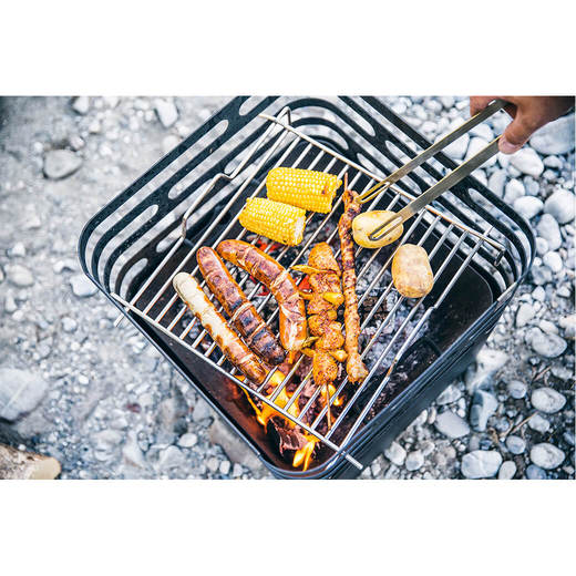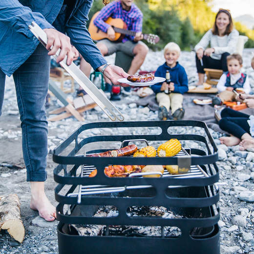 CUBE Fire basket black上部の隙間に引っ掛けて使用するグリル網です。設置高さを変えることで火加減も調整できます。