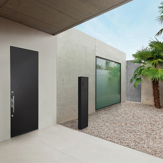 前からも横からも扉を見せない、横取り出しの機能門柱です。ファサードに溶け込みながら存在感のある台形形状のデザインで、外構庭や狭いスペースに設置してもスムーズに取り出せる機能性も持ち合わせています。