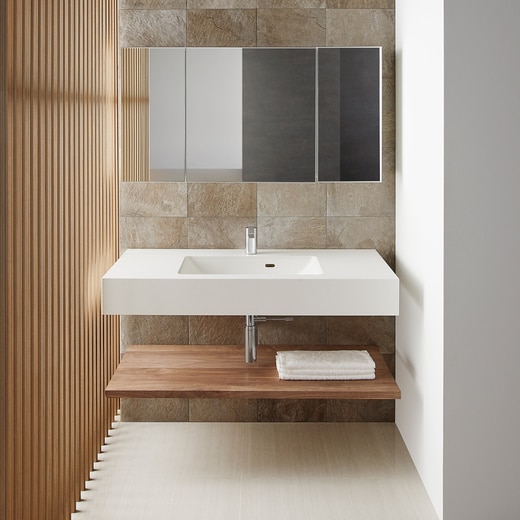重厚感ある天板と美しい前垂れがラグジュアリーな空間を演出する洗面カウンター。カウンター天板と人工大理石のボウルが一体となった事で、つぎ目のない美しいスタイルと、お手入れのしやすさを両立しました。天板には天然石の風合いや質感を持ちながら、キズや汚れに強いクォーツをはじめとした天然の鉱物を原材料に採用。