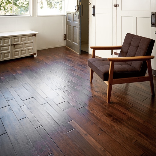 3つの異なる幅の組み合わせと表面のダメージ加工で何年も使い込んだようなヴィンテージ感と、他では類を見ないワイルドでかつ落ち着きのある空間を演出します。