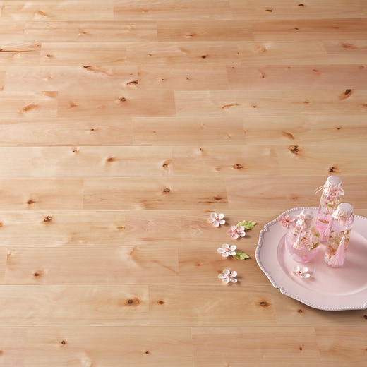 やわらかな木目とほんのりとしたピンク色が特徴のサクラのフローリング。赤みの強めのものから薄いピンクや白っぽいものなど自然な色むらと節が特徴です。程よく固く、桧やレッドパインに近い色味で和洋問わずデザインに落とし込めます。