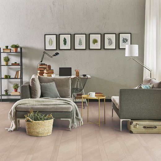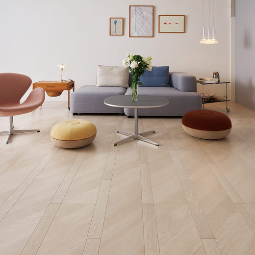 フローリングにアートを取り入れた斬新な柄は、黄金比を採用しており、斜めと縦の交錯が美しいデザインとなっています。従来のヘリンボーンと比較し、コスト面、施工性に優れた1×6サイズの仕様となっており、業界初、柄に合わせて横溝を入れる技術も搭載。また、抗ウイルス・抗菌仕様(SIAAマーク取得)となっており、住まいの床を衛生的に保つことができます。2021年度「グッドデザイン賞」「みらいのたね賞」を受賞。
