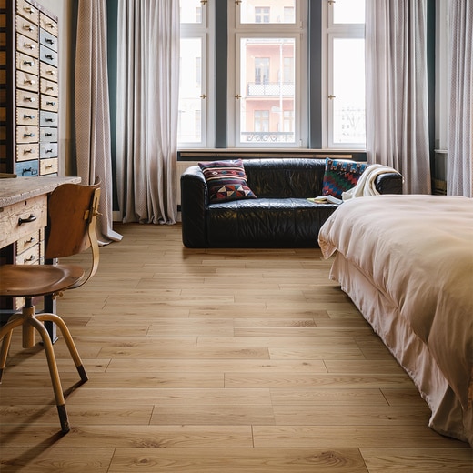SIAA 抗菌・抗ウイルス仕様/良質な銘木から、様々な節や模様を厳選した突板フローリング。触り心地の良いつや消し塗装で、見た目だけでなく触感も楽しんでいただけます。