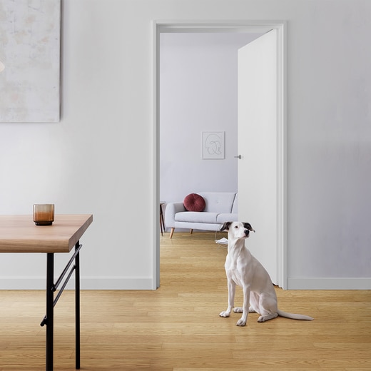 センプリーは、SIAA 抗菌・抗ウイルス仕様/良質な銘木から、様々な節や模様を厳選した突板フローリング。触り心地の良いつや消し塗装で、見た目だけでなく触感も楽しんでいただけます。 この直貼り遮音タイプは、マンション用防音性能(LL-40)と犬にやさしい滑りにくさを兼ね備えています。デザイン性と機能性で、快適なマンション暮らしとペットとの共生を実現します。