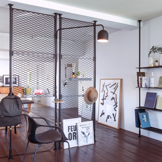 突っ張り棒を活用した、ラギッドなライフスタイルを志向するパーティションユニットです。「空間を仕切る」「好きなものをハンギングする」と、アイデア次第で様々な表現が可能です。ドローアライン《102 Partition A set》:ポール2本・パネル1枚・専用ブラケット同梱