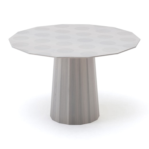 COLOUR WOODシリーズに共通するデザイン哲学を踏襲したダイニングテーブル。伝統的な木工技法「雇い実接ぎ(やといさねつぎ)」を応用し、樽状に木材を組み合わせ特徴的な脚形状をつくり出しています。14角形のテーブルトップは、4~6名が余裕を持って囲めるサイズになっています。ドットは淡いグレーに印象的なドット柄がプリントされています。