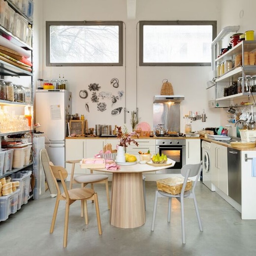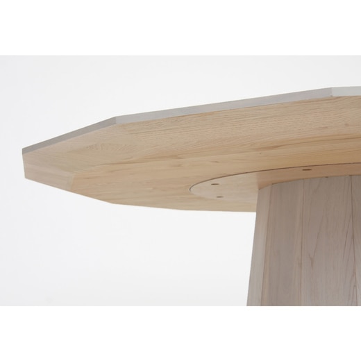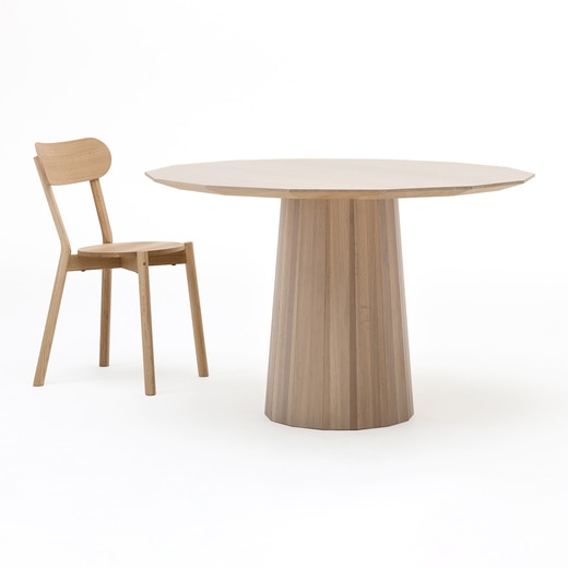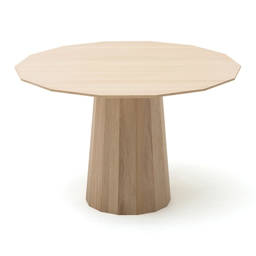 COLOUR WOODシリーズに共通するデザイン哲学を踏襲したダイニングテーブル。伝統的な木工技法「雇い実接ぎ(やといさねつぎ)」を応用し、樽状に木材を組み合わせ特徴的な脚形状をつくり出しています。14角形のテーブルトップは、4~6名が余裕を持って囲めるサイズになっています。プレーンはナチュラルな木の質感を活かしました。
