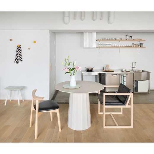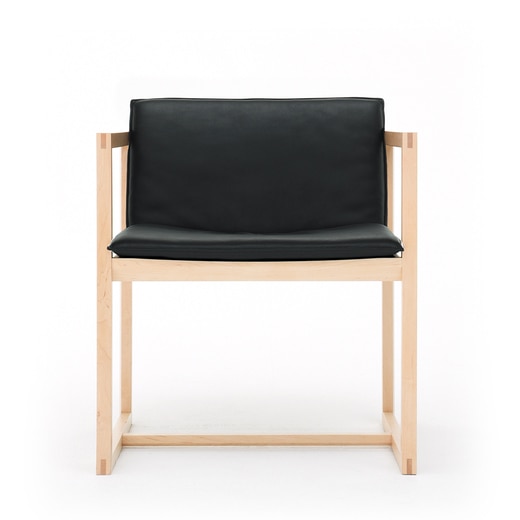 美しい座り姿を提案する椅子。「美しく座る」というコンセプトのもと、デザインされたREN。一般的な椅子に比べ、背もたれを少しだけ低く設定したことにより、背筋が伸び、自然と美しい姿勢を取ることができます。直線的で落ち着いた印象を持ち、和の空間にもオススメのデザインです。座布団のように載せるタイプのクッションは、革素材です。