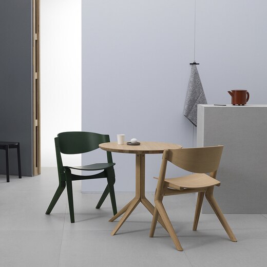 テーブル:SCOUT BISTRO TABLE ピュアオーク/チェア:左からSCOUT CHAIR モスグリーン/ピュアオーク
