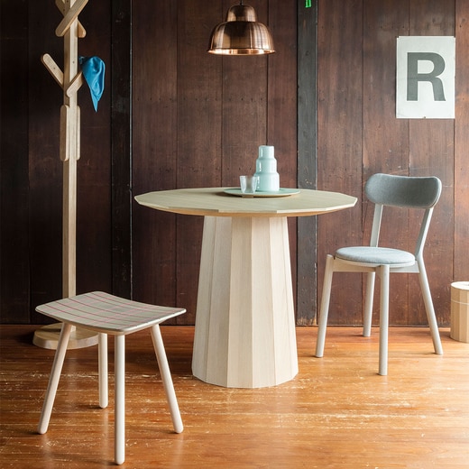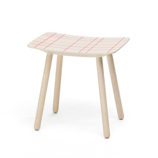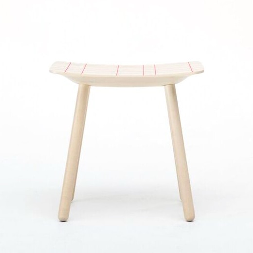 ミニマルかつ精緻なデザインが特徴的なスツール。座面に施された鮮やかなグリッドのラインは、溝に色入れをした後、はみ出した部分の塗装膜(厚さ数10ミクロン)を手作業で削るという卓越した職人技によるものです。また、座面の裏側の有機的な形状や脚の接合方法にもこだわりを見せています。日本の居住性を意識したスモールオブジェクトで、狭小空間にもオススメです。