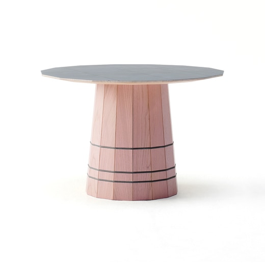 樽のような脚と15角形の天板が特徴的なテーブルは、どことなく親しみを感じる姿をしています。現代的なグラフィックを通して見える木目とカラーリングを組み合わせたことで、さまざまなライフシーンに溶け込むサイドテーブルシリーズができました。日本古来の技法「雇い実接ぎ(やといさねつぎ)」を応用し、台形にカットされたパーツを難しい角度で連続につなげています。