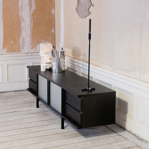 このサイドボードとメディアコンソールは、木製の柱で作られた日本の伝統的な住宅や襖、障子からインスピレーションを得ています。コンソールのハンドルと脚は、ガラスドアを完全に閉めたとき直線となり、日本の建築における精度と調和のディテールを反映しています。