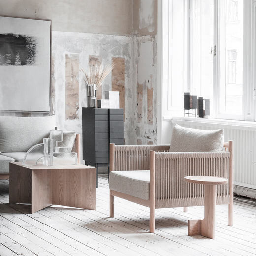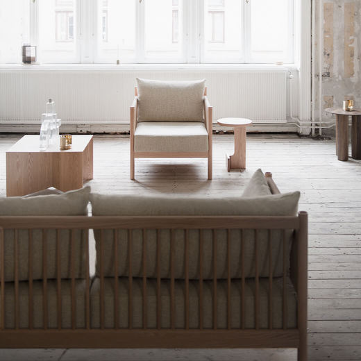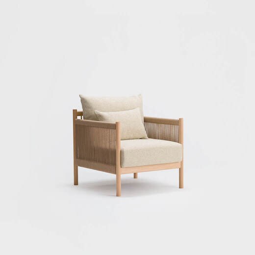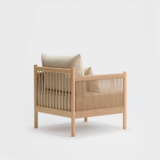 背面に並んだ細木とペーパーコードを編み込んだ肘掛けは、古典的な竹建築と畳の模様に影響を受けたものです。深く低いソファは広くゆったりとした雰囲気のために創作されており、背面の美しい構造は壁面に沿っておいても、空間の中央に置いても完璧です。