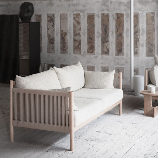 背面に並んだ細木とペーパーコードを編み込んだ肘掛けは、古典的な竹建築と畳の模様に影響を受けたものです。深く低いソファは広くゆったりとした雰囲気のために創作されており、背面の美しい構造は壁面に沿っておいても、空間の中央に置いても完璧です。