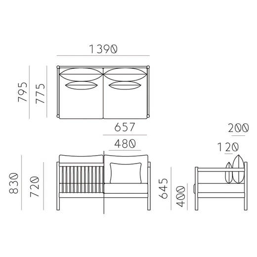 背面に並んだ細木とペーパーコードを編み込んだ肘掛けは、古典的な竹建築と畳の模様に影響を受けたものです。深く低いソファは広くゆったりとした雰囲気のために創作されており、背面の美しい構造は壁面に沿っておいても、空間の中央に置いても完璧です。