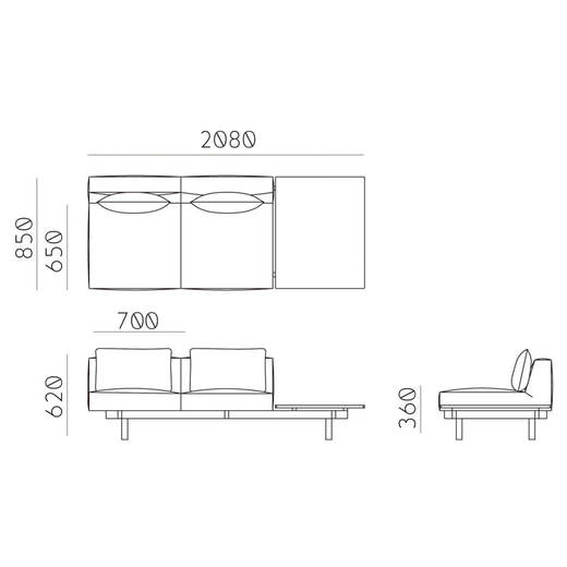 筏(いかだ)のようにシンプルに無垢材を組んだフレームにクッションを載せたソファです。深い奥行きと低く抑えた背もたれによって、小さなスペースでもフィットするボリューム感となっています。使い方もバラエティーに富み、仮眠をとるベッドとしても、広い座面の上であぐらをかくこともできます。