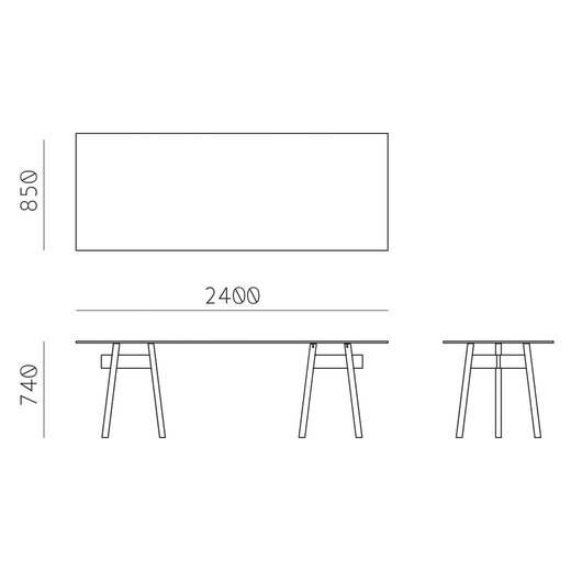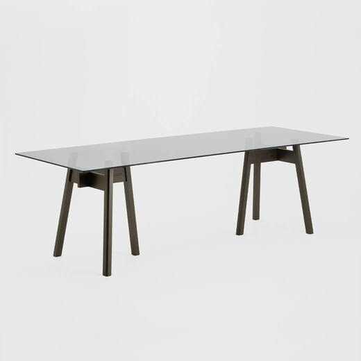 主にガラスや一枚板などの重量のある天板に対応した架台です。二つのパーツを簡便な組木によってジョイントし、構造的な強度を引き出すために、3本の脚は中心に向かって傾斜させています。一枚板のような複雑な形の天板や、ガラス天板であってもマッチするシンプルなデザインです。スモーキーガラスのため足元が気になりにくく、ミーティングテーブルにも適しています。