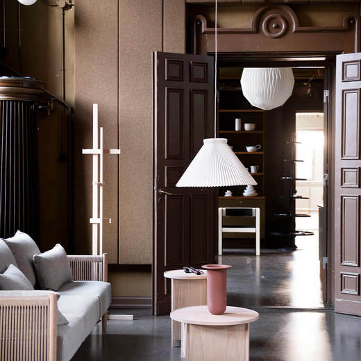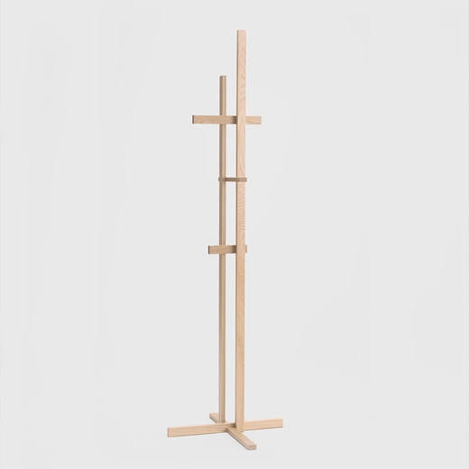 このコートスタンドは、木の構成部品は全て同じ材料で長さのみを変化させていますが、方向・場所・角度を変えて不均一に組み上げることにより、視点によって様々な表情を見せるデザインとなっています。