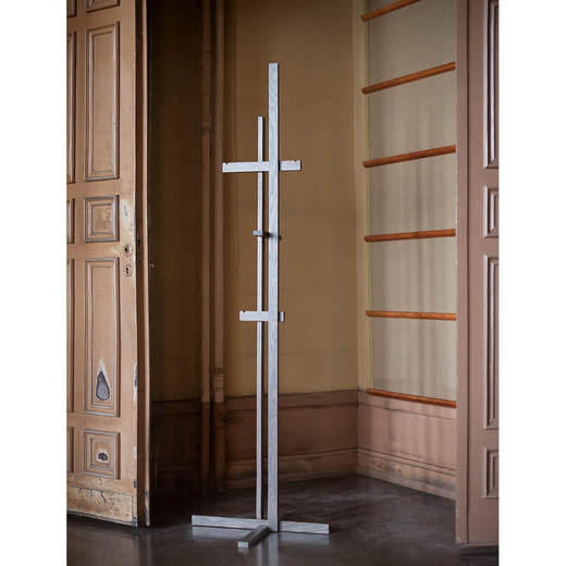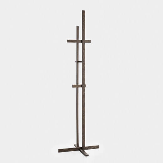 このコートスタンドは、木の構成部品は全て同じ材料で長さのみを変化させていますが、方向・場所・角度を変えて不均一に組み上げることにより、視点によって様々な表情を見せるデザインとなっています。