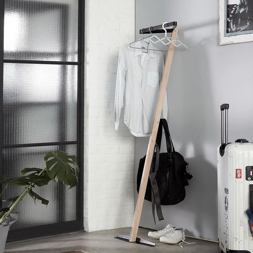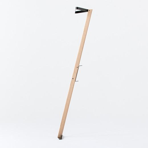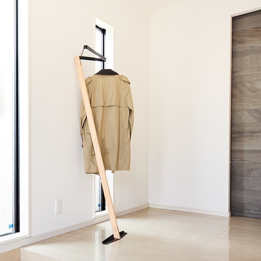 オークの無垢材を贅沢に使い、スチールで成形した三角形のハンガー部とベース、背面フックもすべてスチールのプレートで出来た壁掛けハンガー。来客時に玄関や廊下に設置して上着をスマートに預かるだけではなく、普段は植物などをハンギングし見せる収納としての使い方もおすすめです。