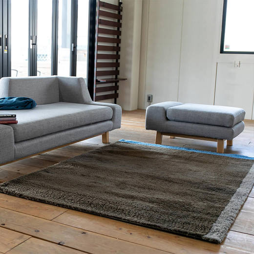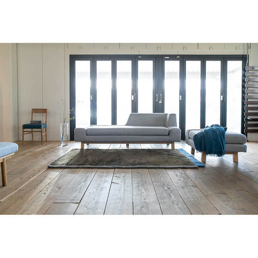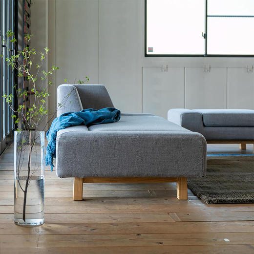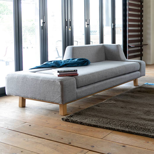 背・肘ともに低く設定され、部屋の中心においても圧迫感を感じないアシンメトリーな形状が個性的なソファです。座クッションは固めのウレタンを使用し、しっかりとした座り心地です。