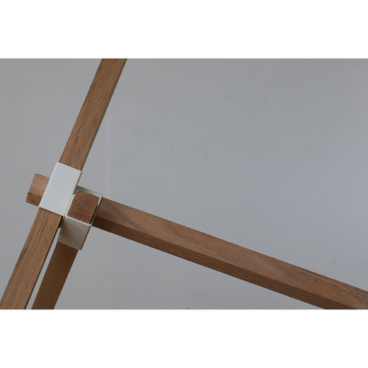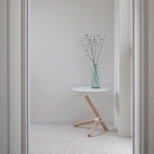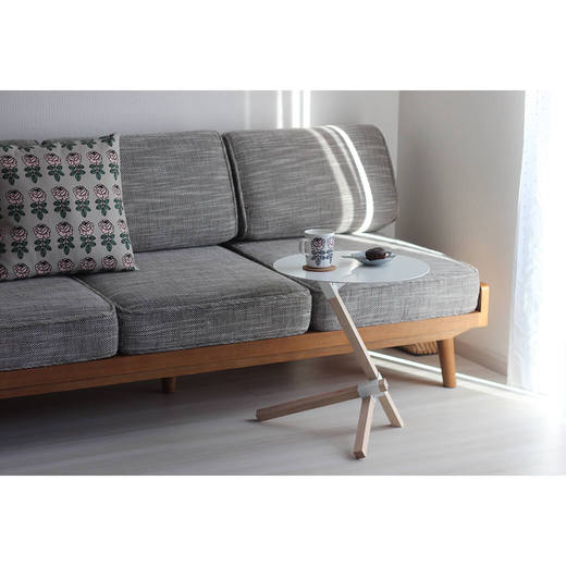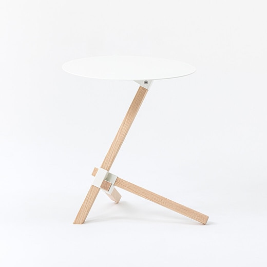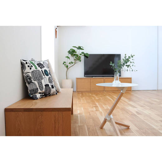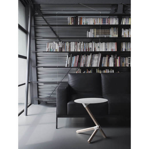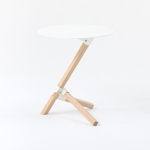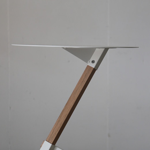 スチール製の丸い天板とオークの無垢材で構成されたミニマルなデザインは、現代のインテリアに馴染みがよく、溶け込んでくれます。まるで古代の彫像のような美しさを放つ三本の角材の組み合わせは、見る角度によって全く違った見え方になり、建築的な構造が楽しめるプロダクトです。