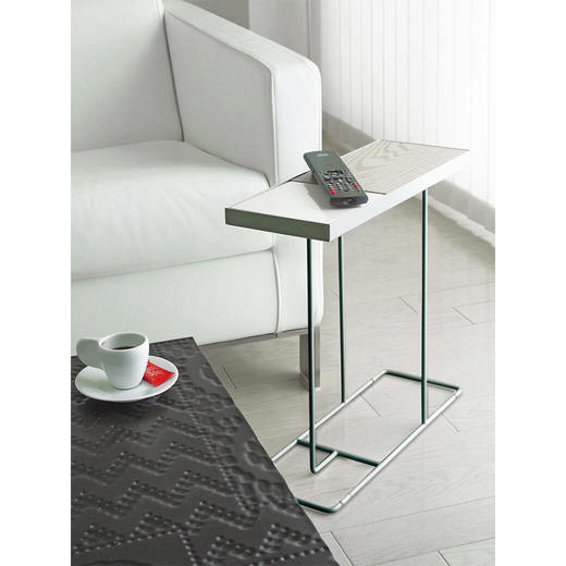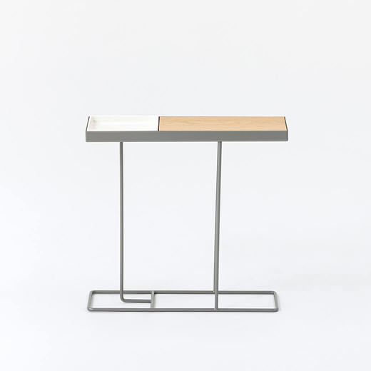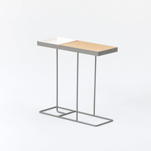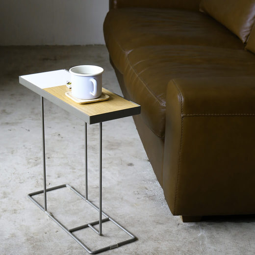 脚部はスチールのロッド、天板は木と陶器、それぞれの素材のコンビネーションが美しいサイドテーブル。ソファーサイドにぴったり収まり、マグカップやテレビのリモコン、スマートフォンを置く際にちょうど良いスマートなサイズです。玄関先や廊下などのスペースの少ない場所でもお出かけのカバンや、ディスプレーテーブルとしても活躍します。