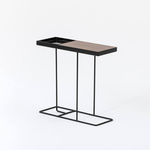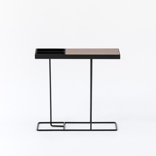 脚部はスチールのロッド、天板は木と陶器、それぞれの素材のコンビネーションが美しいサイドテーブル。ソファーサイドにぴったり収まり、マグカップやテレビのリモコン、スマートフォンを置く際にちょうど良いスマートなサイズです。玄関先や廊下などのスペースの少ない場所でもお出かけのカバンや、ディスプレーテーブルとしても活躍します。