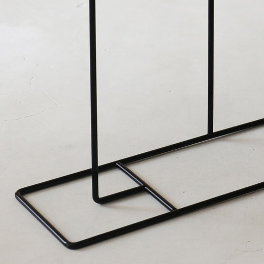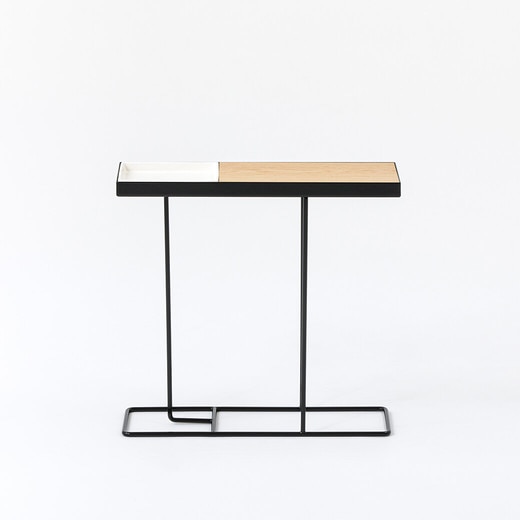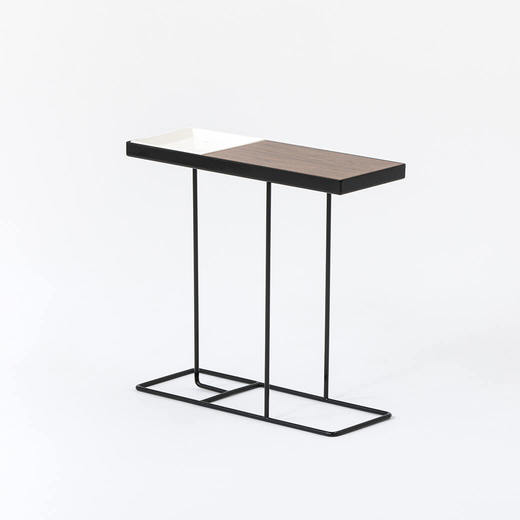 脚部はスチールのロッド、天板は木と陶器、それぞれの素材のコンビネーションが美しいサイドテーブル。ソファーサイドにぴったり収まり、マグカップやテレビのリモコン、スマートフォンを置く際にちょうど良いスマートなサイズです。玄関先や廊下などのスペースの少ない場所でもお出かけのカバンや、ディスプレーテーブルとしても活躍します。