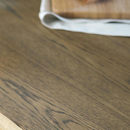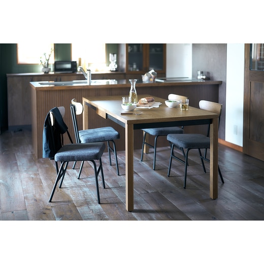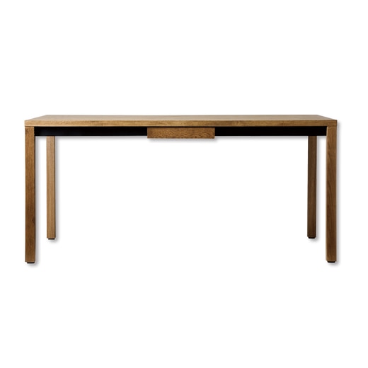 テーブル中央に引き出しを備え、カトラリーなどの収納に便利なダイニングテーブル。木材とスチールを組み合わせたデザインが印象的で、貫フレームに使われたスチールが木の風合いを際立たせます。構造面でもスチールフレームでしっかり補強されており、見た目と実用性を兼ね備えた一台です。