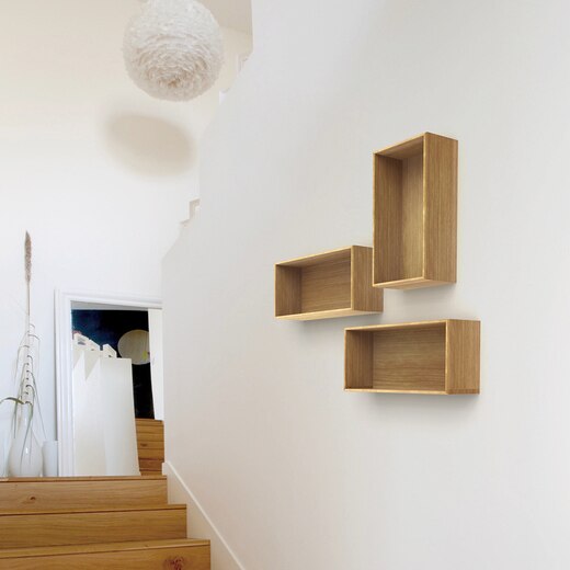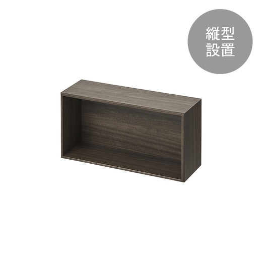 正方形の基本モジュールの半分のサイズで、奥行きが他のボックスよりも浅いタイプのボックスです。 シンプルな外観は単体でも空間に映え、他のサイズと組み合わせてもお使いいただけます。床置き、壁付けが可能。(安全荷重5kg)