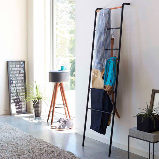 ズボンやスカーフの収納や洋服の一時掛けにも便利な立て掛けラダーハンガー。S字フックを使用すればベルトなどの小物も収納できます。タオルや衣類の一時掛けにも便利でスリムな立て掛け設計なので置く場所を選びません。