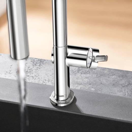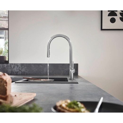 表面仕上げ:クロム 吐水口回転角度:60度、110度、150度(旋回中心を段階的に調整可能)および360度 ※ヘッド引き出しタイプは、ホースを伝わって水滴がキャビネット内に落ちることがありますので、別売りの水受容器(品番KK07861)のご使用をおすすめします。 ※1901年、ハンス・グローエ氏によって創設されたシャワーと水栓金具の老舗メーカー「ハンスグローエ」。 世界シェアNo.1を誇るシャワーから洗面、キッチン水栓まで革新的なテクノロジーを追求し、 業界のスタンダードを作り続けるイノベーションブランドです。 高い技術力に裏打ちされた革新性と快適性、数々の受賞歴をもつ優れたデザイン、エコ性能で、 世界の一流ホテルから一般のご家庭まで幅広く愛されています。