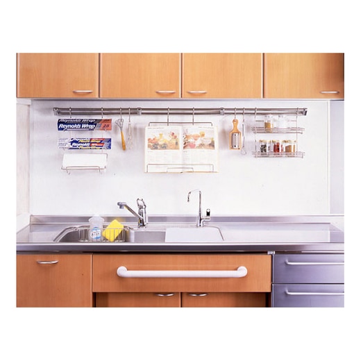 壁面・吊戸棚の底 両用タイプです。対面式キッチンや出窓付キッチンにも対応できます。7種類のラック・フックを組み合わせて自由なレイアウトが可能です。