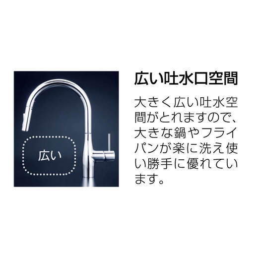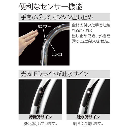 センサー部分に手をかざすだけで吐水・止水ができるセンサー式水栓。料理中に汚れた手も水栓を汚すことなく洗うことができます。(一般地用)