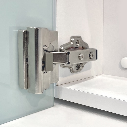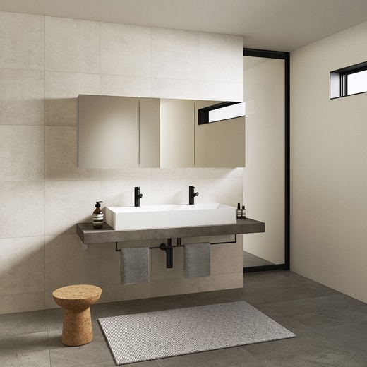 合わせガラスの扉が美しいミラーボックス≪スミス≫。圧迫感を感じさせないフレームレスのミラーが、上質な洗面空間を演出します。本体奥行が135mmとスリムながらも、洗面用品や洗面家電を十分に収納できます。コンセント付き仕様やくもり止め仕様もご用意しております。