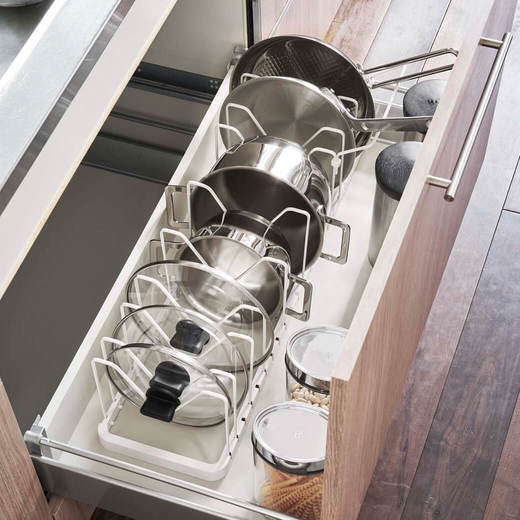 - ●サイズ 約幅450~825mm×奥行255mm×高さ175~210mm(持ち手置き含む) ●材質 本体:ABS樹脂 仕切りパーツ:スチール(粉体塗装) ●対応サイズ 180~300mmまでの鍋(鍋蓋)・フライパン 1ピッチ約250mm(仕切りパーツ含まず) ※2ピッチ目から約30mmごとに拡がります。 ●耐熱温度80℃/耐冷温度-40℃ ※本製品は組み立て商品です。 ※引き出しのサイズや形状によっては設置できない場合がありますのでご了承ください。 ※収納するものに付着している水気はよく拭き取ってから収納してください。 ※収納するものが熱い状態のまま置かないでください。