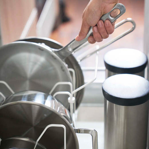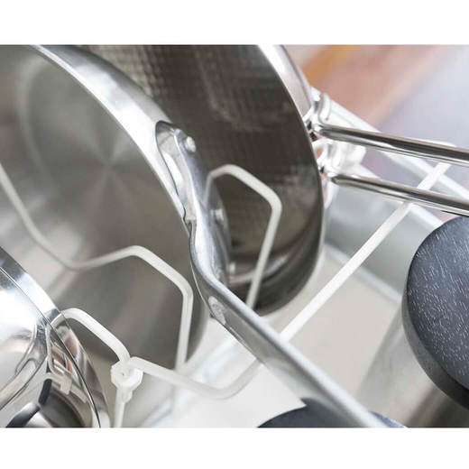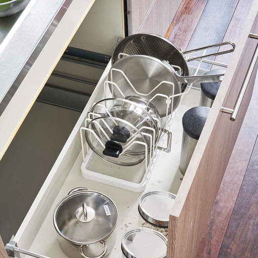シンク下のスペースに合わせて伸縮可能な鍋蓋&フライパンスタンド。鍋やフライパンのサイズに合わせて仕切りパーツの位置は3cmごとに調整できます。フライパンが取り出しやすい持ち手置きパーツや、鍋蓋が取り出しやすい構造によりスムーズに調理いただけます。