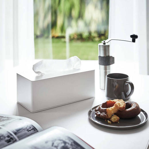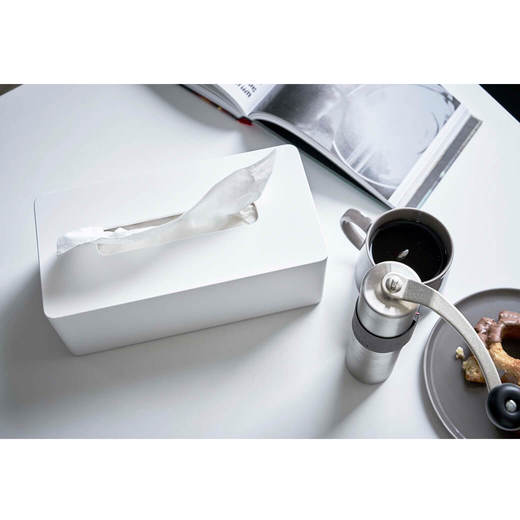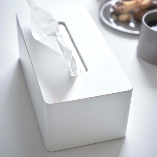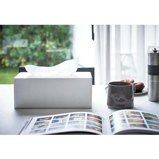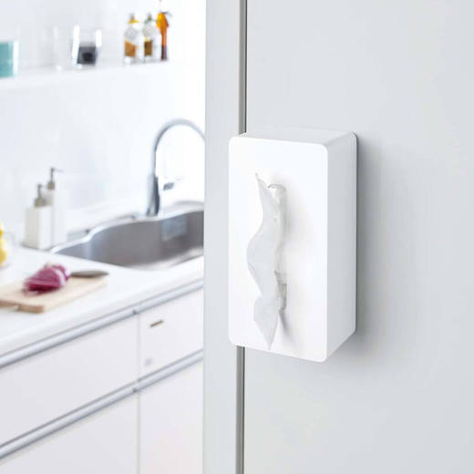 冷蔵庫の側面などにマグネットで簡単に取り付けられるティッシュケース。ティッシュペーパーだけでなく、ボックスタイプのキッチンペーパーにも対応しています。重厚感があるので、そのまま置いても使えます。中の仕切り板を調整することで高さのある保湿タイプのティッシュボックスも収納できます。