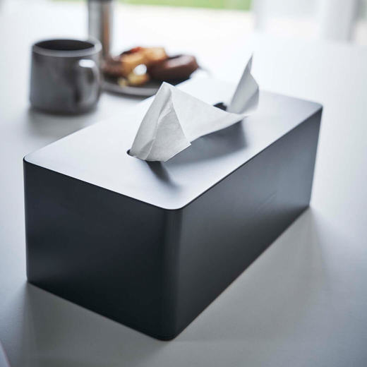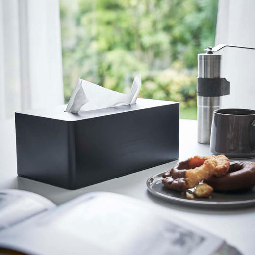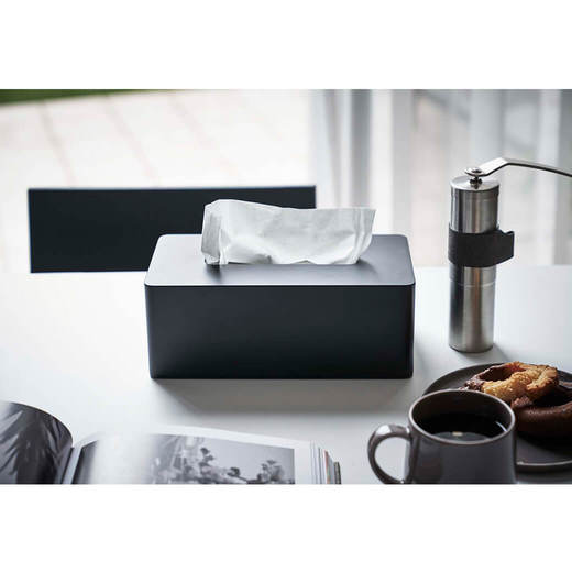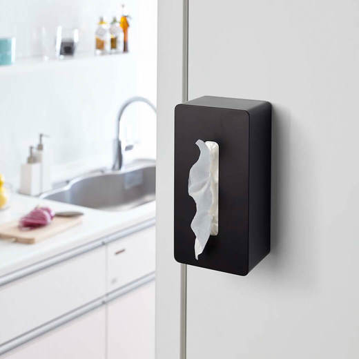 冷蔵庫の側面などにマグネットで簡単に取り付けられるティッシュケース。ティッシュペーパーだけでなく、ボックスタイプのキッチンペーパーにも対応しています。重厚感があるので、そのまま置いても使えます。中の仕切り板を調整することで高さのある保湿タイプのティッシュボックスも収納できます。