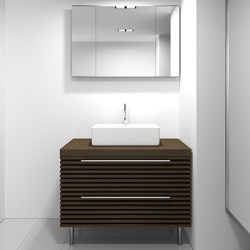 - ●材質 天板:メラミン化粧板 外部:オレフィンシート貼 内部:カラー合板 取手:ステンレスヘアライン仕上 脚:アルミ無垢材削りだし仕上 サイレントレール式収納金物 ※水栓・洗面ボウル・排水金物等は付属しておりません。 ※洗面ボウルは、製造上、寸法誤差がございます。現物を確認の上施工してください。 ※キャビネットや扉・引出しが濡れた場合はすぐに拭き取るなどこまめにお手入れしてください。濡れたまま放置すると、僅かな隙間から水が入り込み基材である木部が吸水して膨張やはがれの原因となります。