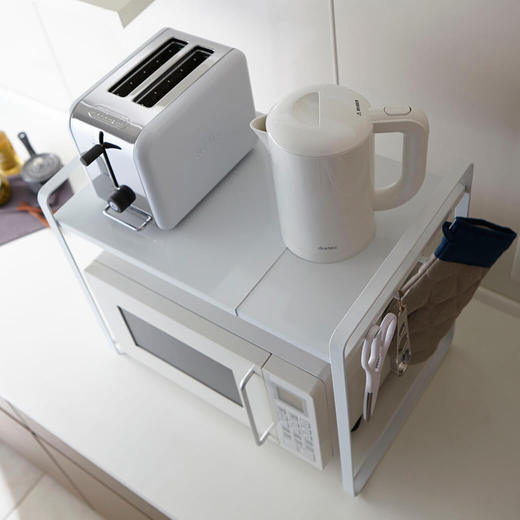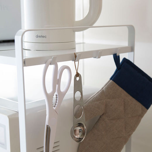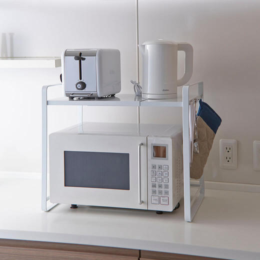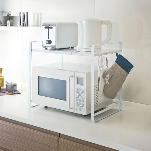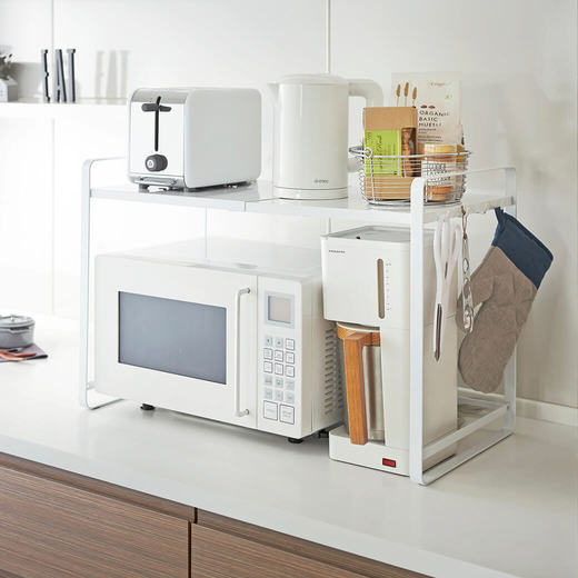 シンプルで使いやすい電子レンジ収納ラックです。約47.5~75cmまで伸縮可能で、お使いの電子レンジに合わせることはもちろん、コーヒーメーカーなど背の高い調理器具と一緒に収納することも可能です。