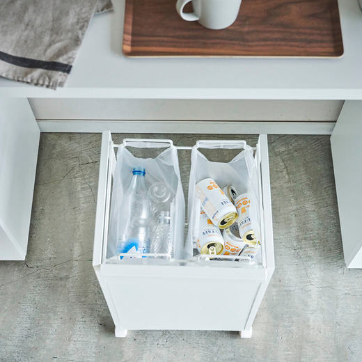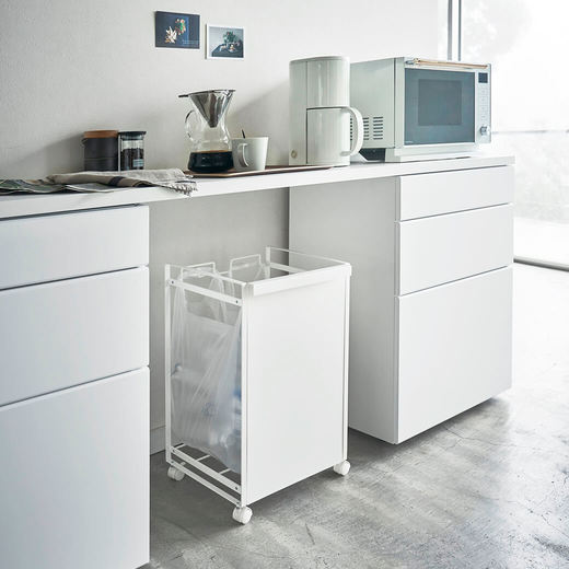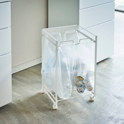 レジ袋を隠して分別できるスタイリッシュな分別ダストワゴン。瓶・缶・ペットボトルなどを分別できます。お手持ちのコンビニやスーパーのレジ袋を引っ掛けてお使いいただけます。キャスターが付いているので、袋の取り外しやお掃除の際の移動もスムーズです。