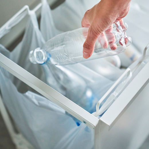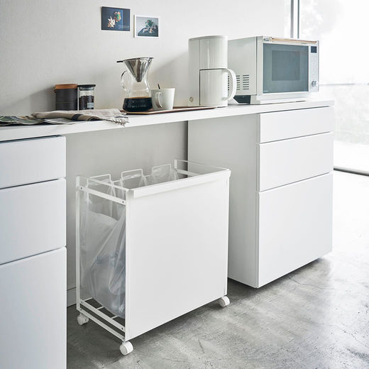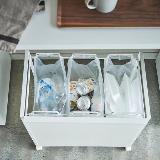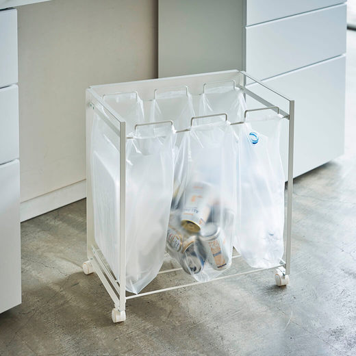 レジ袋を隠して分別できるスタイリッシュな分別ダストワゴン。瓶・缶・ペットボトルなどを分別できます。お手持ちのコンビニやスーパーのレジ袋を引っ掛けてお使いいただけます。キャスターが付いているので、袋の取り外しやお掃除の際の移動もスムーズです。