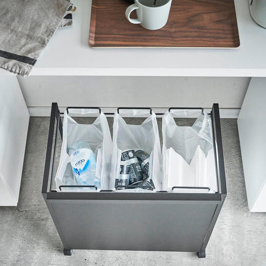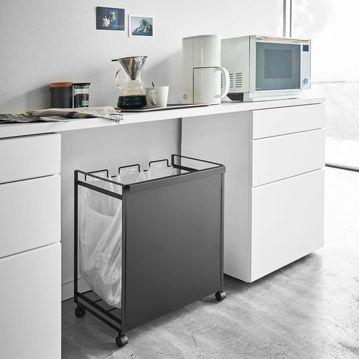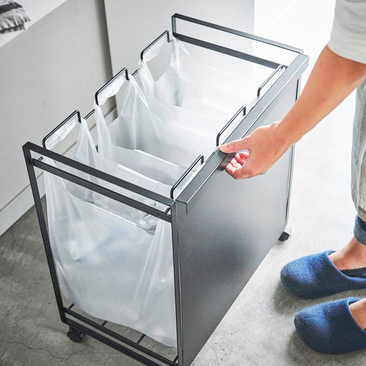 レジ袋を隠して分別できるスタイリッシュな分別ダストワゴン。瓶・缶・ペットボトルなどを分別できます。お手持ちのコンビニやスーパーのレジ袋を引っ掛けてお使いいただけます。キャスターが付いているので、袋の取り外しやお掃除の際の移動もスムーズです。