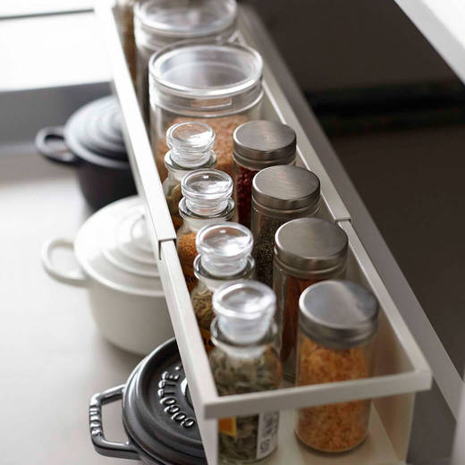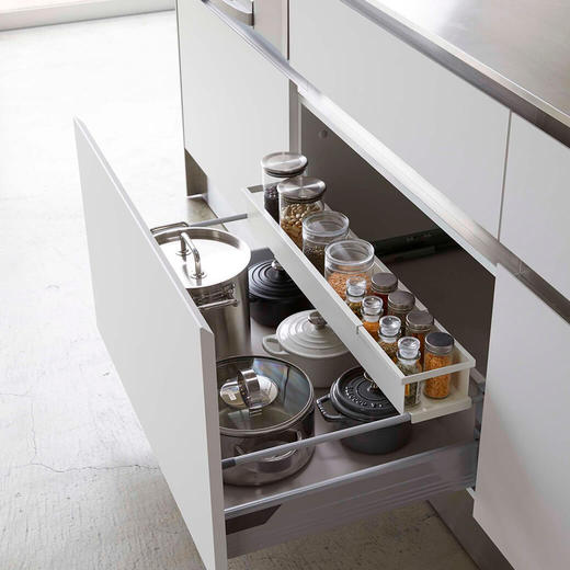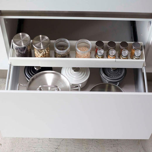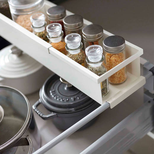 引き出しの幅に合わせてピッタリフィットする伸縮ラック。引き出しのスペースを2段に分けられます。サイドバーに引っ掛けるだけの簡単設置、収納部の奥行は約10cmとスリムなのでスパイスボトルや保存容器などの小物収納に便利です。